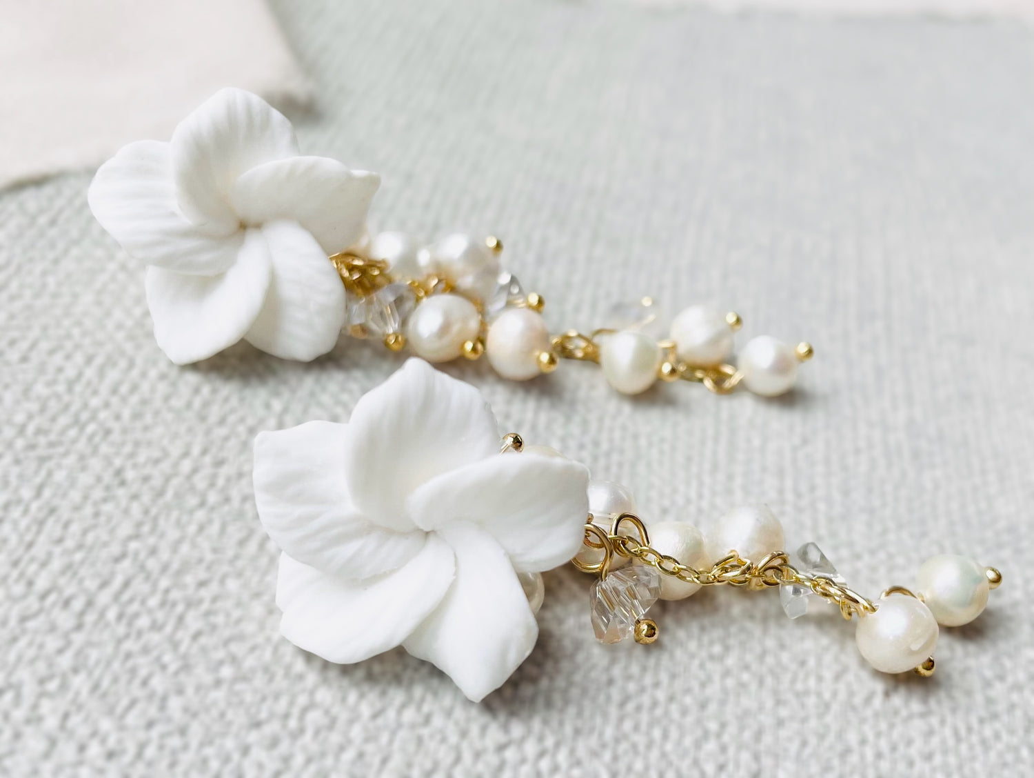 The individual clay florals are hand sculpted with texture and shape, all hand-wired with quality genuine pearls. With their unique combination of elements, the Adrienne earrings are sure to make you stand out and accessorise your bridal style perfectly.