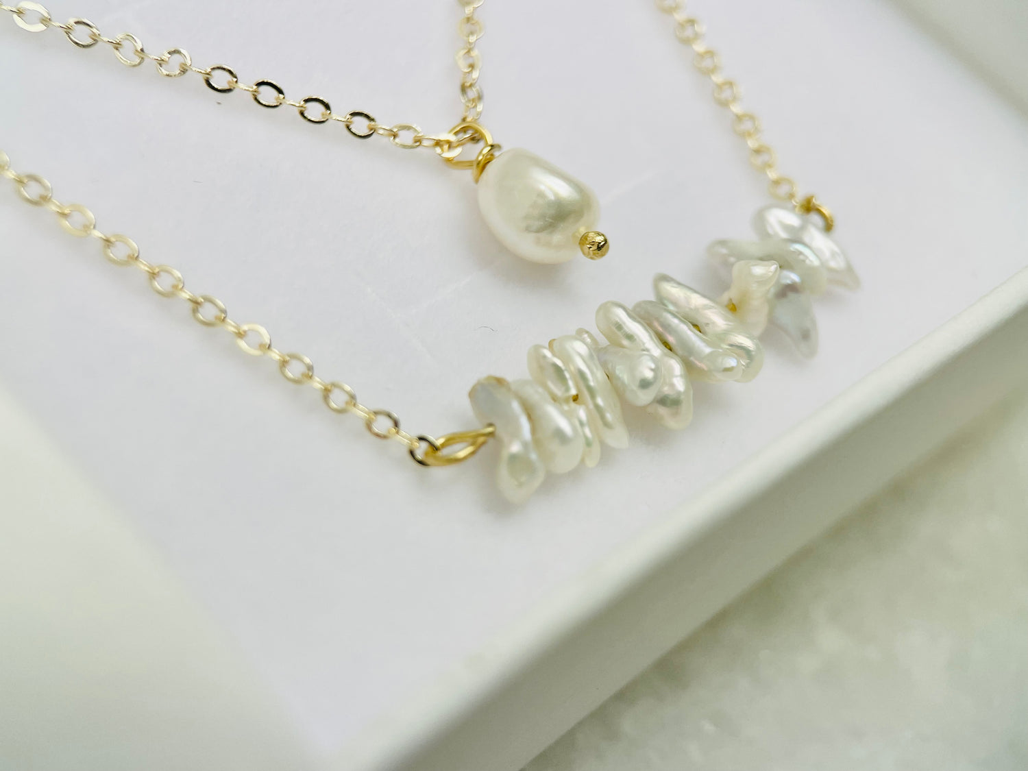 With the Aurora necklace you get two separate real pearl necklaces. made with the most exquisite, high grade Keshi pearls. Keshi pearls are a rare pearl that possess a multitude of tomes which are a blend of ivory, grey, silver and gold.