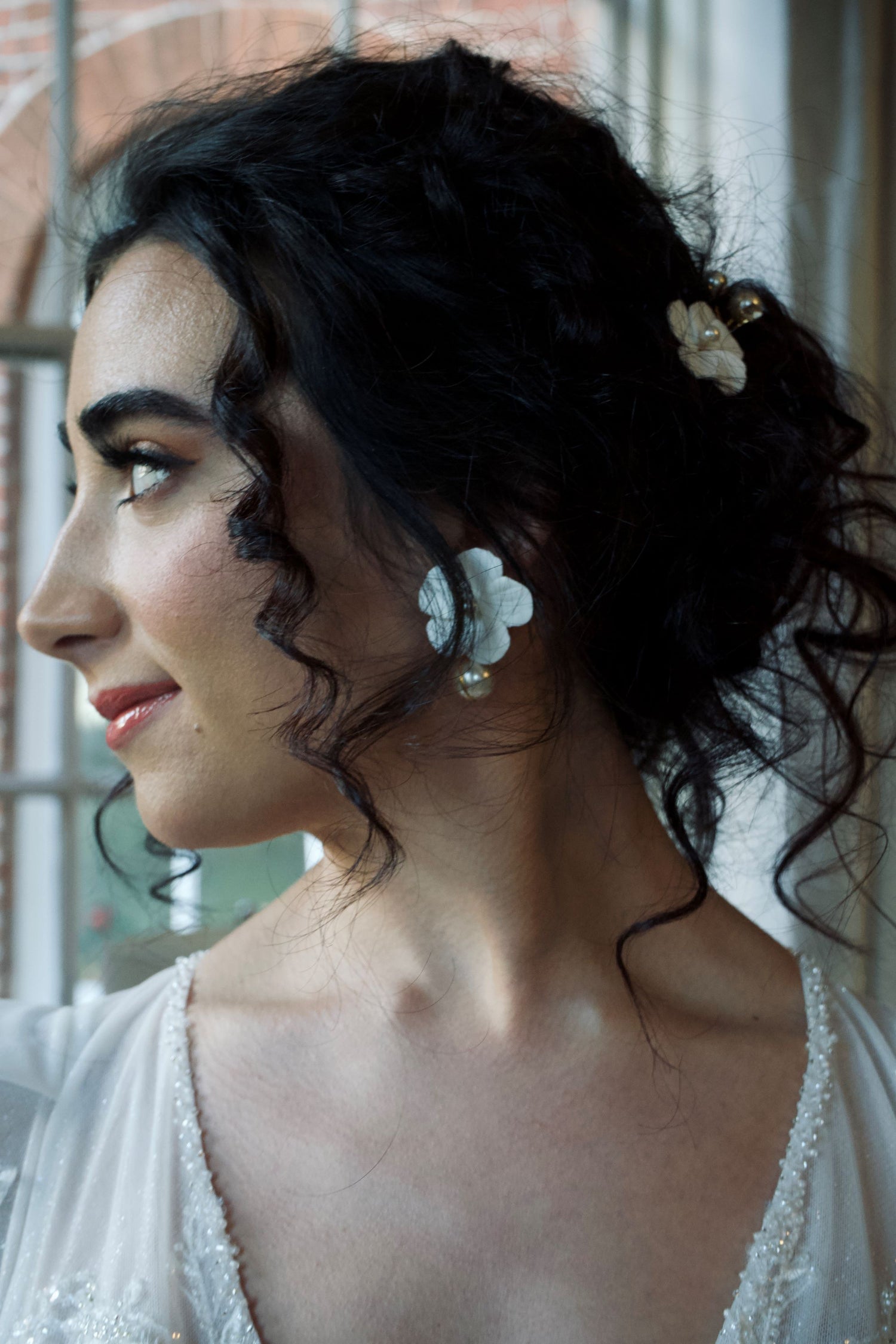 The individual clay florals are hand sculpted with texture and shape, all hand-wired with quality Precosia pearls have an exquisite lustre which catches in the light. With their unique combination of elements, the Bloom earrings are sure to make you stand out and accessorise your bridal style perfectly.