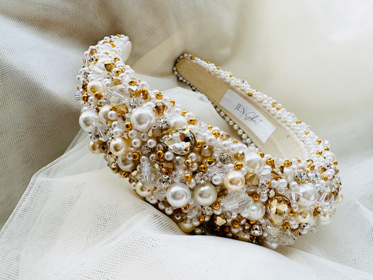 Carmen Bridal Headband – Handmade Gold Wedding Hair Accessory with Pearls & Crystals