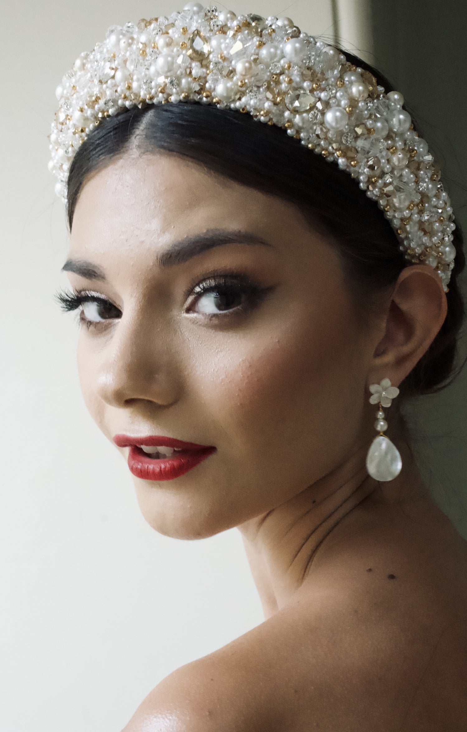 The Carmen Headband is a bold and luxurious bridal accessory, designed to make a statement. Hand-placed Preciosa Czech glass pearls and gold reflective crystals are finished with delicate galvanised gold beads, creating a richly encrusted headband that adds warmth and elegance to any bridal look.