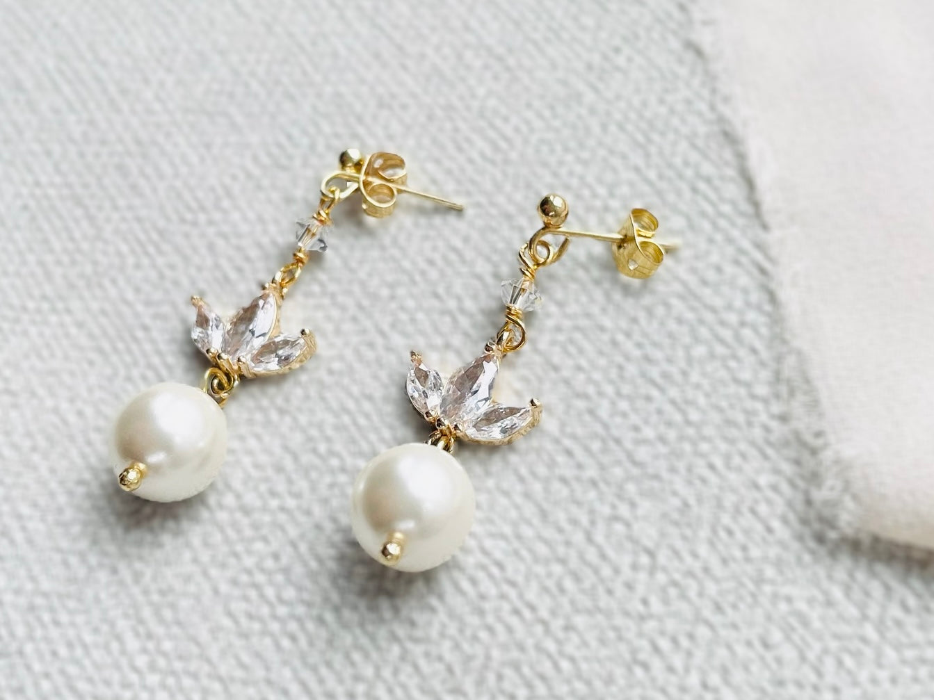 The Helena earrings offer enough lustre and shimmer from the pearl and crystals for these to be a luxury detail to your final bridal look. They are comprised of a stunning Preciosa pearl and leaf motif zircon gold stud and will compliment a range of bridal gowns and hair styles.