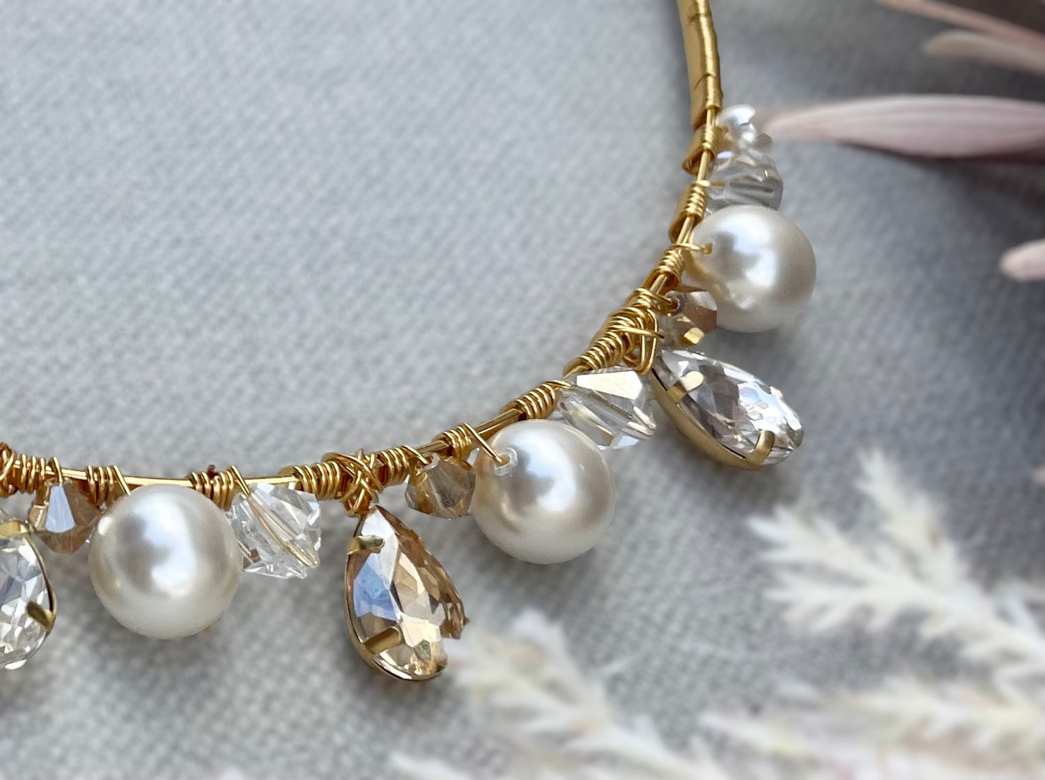 The Emma Headband is a refined bridal hair accessory, designed to add a touch of sparkle and elegance to your wedding day. Hand-wired with deluxe Preciosa Czech glass pearls and shimmering teardrop crystals, it’s a versatile piece that works beautifully with both updos and sleek down styles.