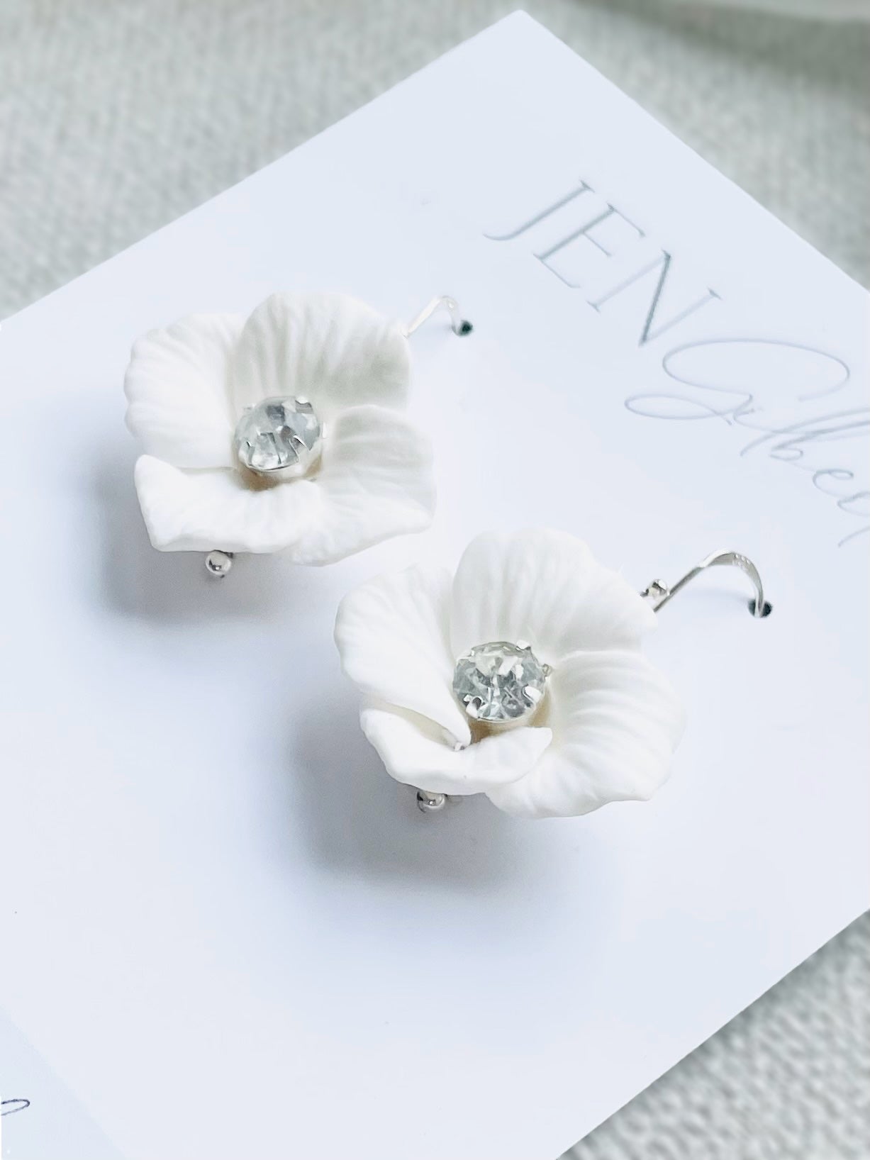 These hand sculpted Faye clay floral earrings are simply stunning. Designed to resemble the delicate hydrangea flowers with a stunning Preciosa crystal centre. These earrings hang elegantly from a sterling silver or gold vermeil ear wire and are beautifully delicate with intricate petal details and make a beautiful statement earring.