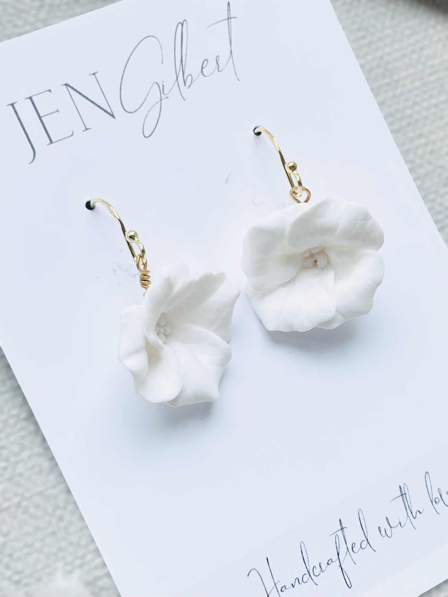 These handsculpted Faye clay floral earrings are simply stunning. Designed to resemble the delicate hydrangea flowers with a clay centre stamen. These earrings hang elegantly from a sterling silver or gold vermeil ear wire and are beautifully delicate with intricate petal details and make a beautiful statement earring.