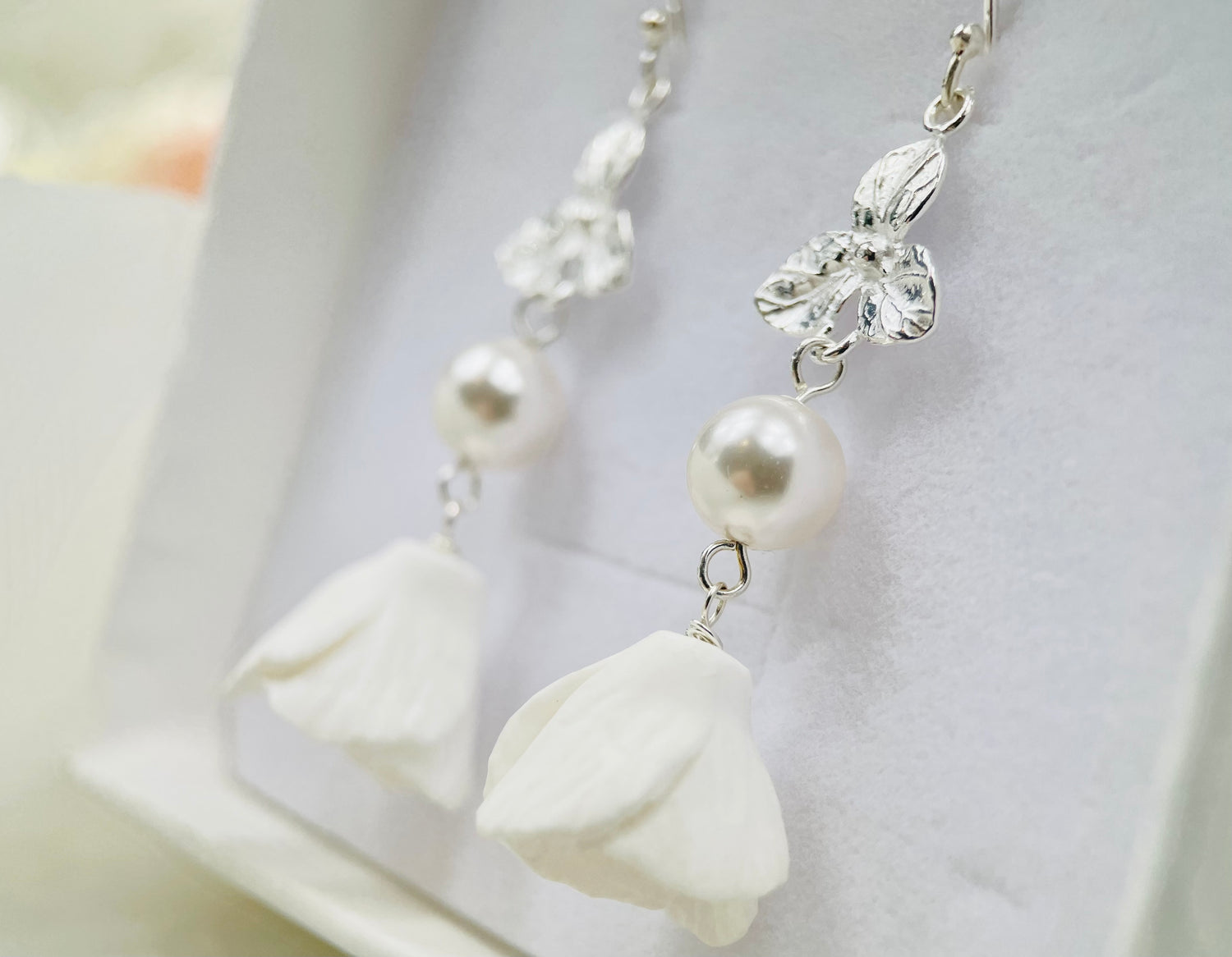 This luxe blend of Preciosa pearls offers and hand sculpted florals make a perfect combination. The sterling silver or vermeil gold flower connector adds a luxe detail worthy of the bridal earring