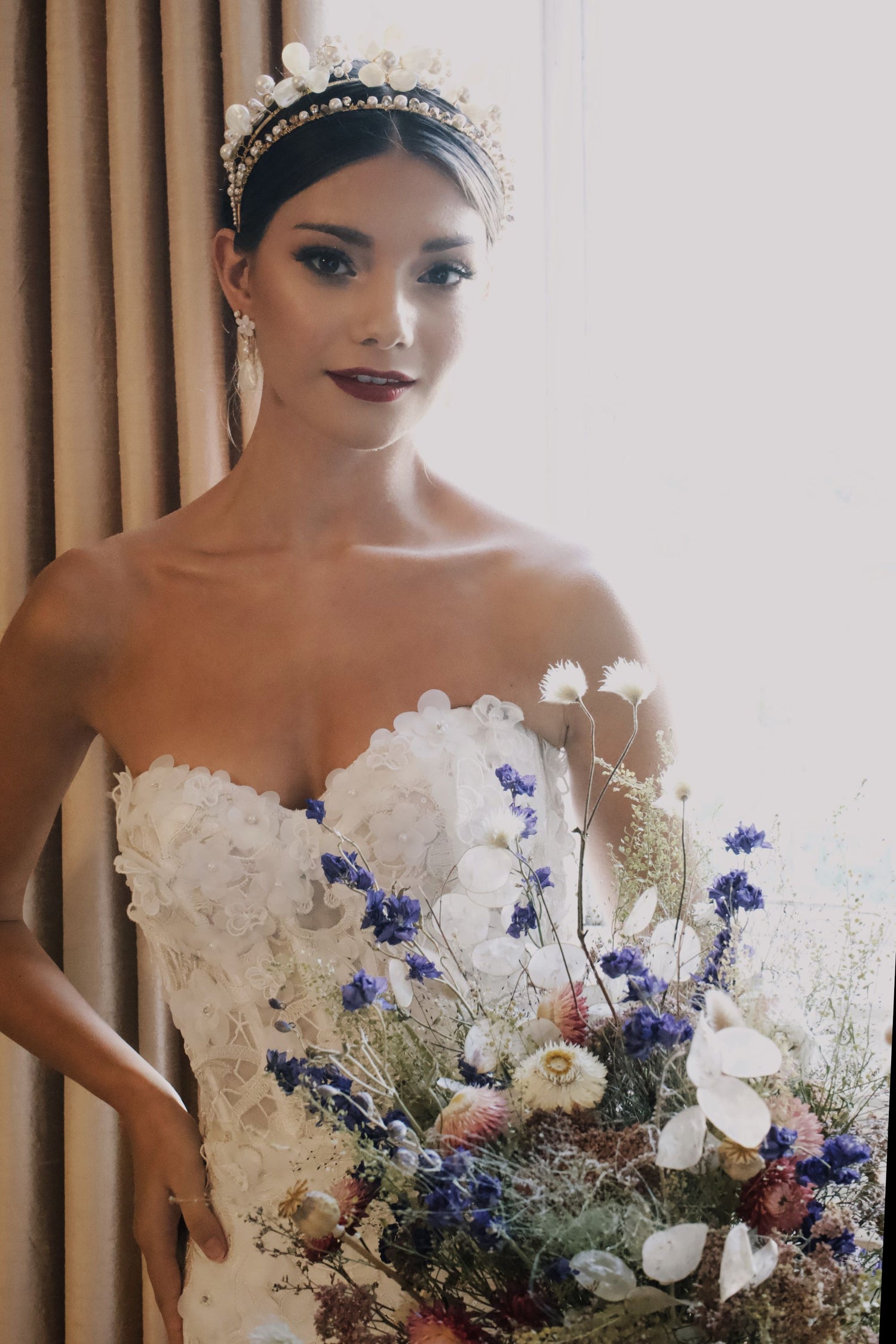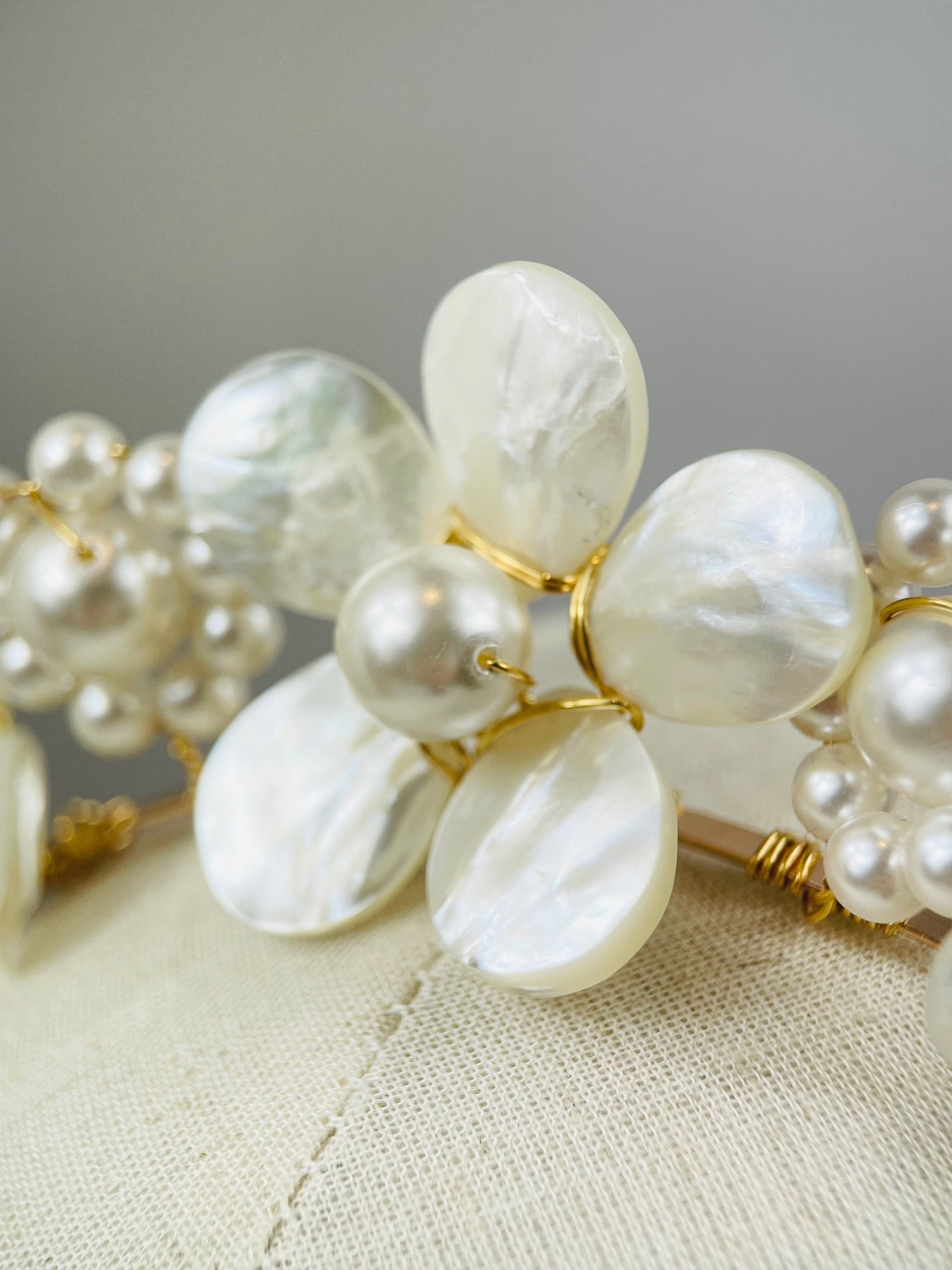 The Florentina Tiara is beautifully crafted with genuine Mother of Pearl petals and luxurious branded Preciosa Czech glass pearls. Delve into details of this stunning bridal accessory .