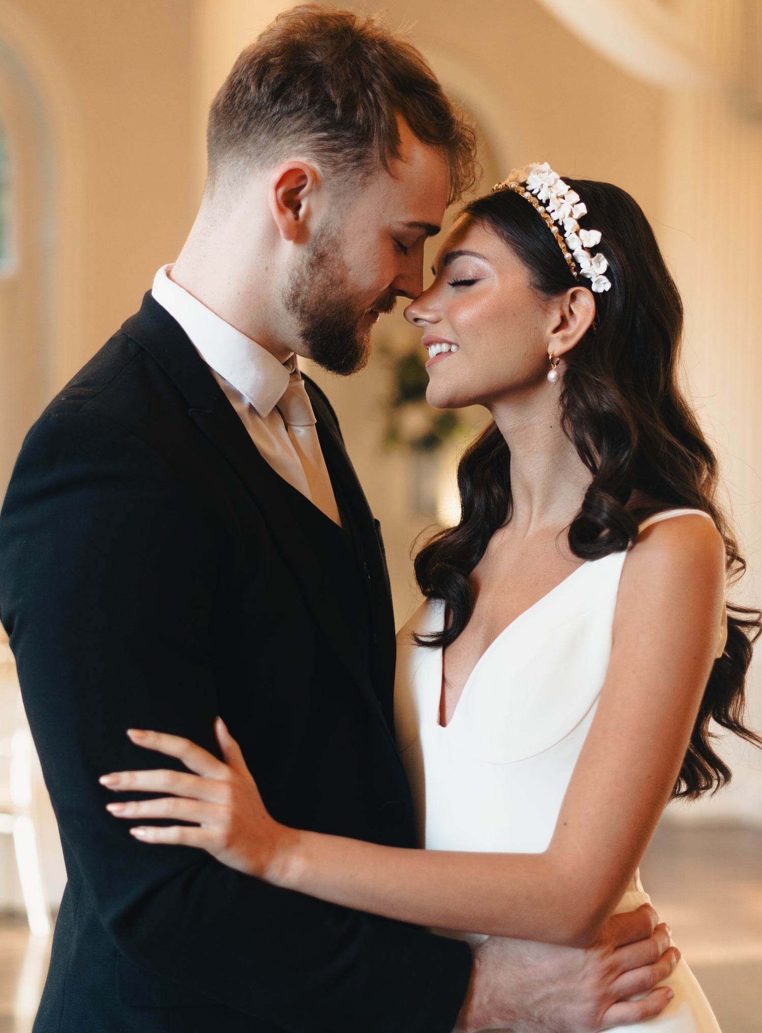 This crown sits comfortably and securely, whether you’re wearing your hair up or down, with or without a veil. Its lightweight design means you can wear it all day without fuss, and its subtle floral detailing works beautifully with a wide range of bridal styles.