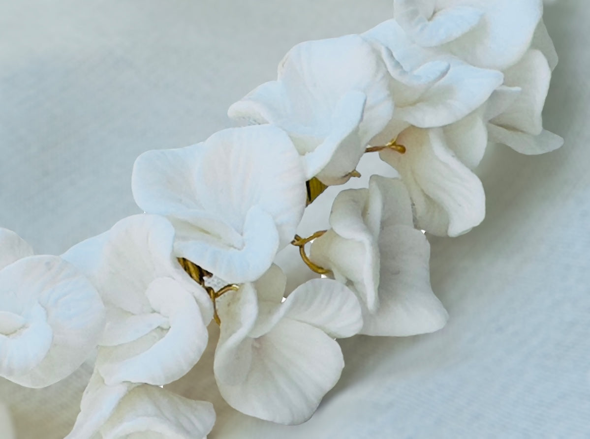 The Hermione Crown is a delicate bridal headpiece designed for brides who want something truly personal. Each three-petal blossom is sculpted by hand and wired close to the band, creating a soft, understated look that feels elegant and unique.