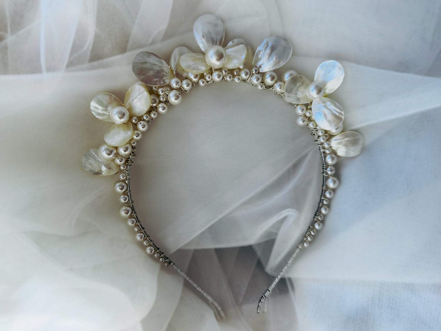 Each flower is shaped from high-grade mother of pearl with a soft ivory or pale cream tone, giving the tiara a timeless look that works beautifully with any gown. Whether you wear it with a veil or on its own, the Katarina adds a refined touch to your bridal style.