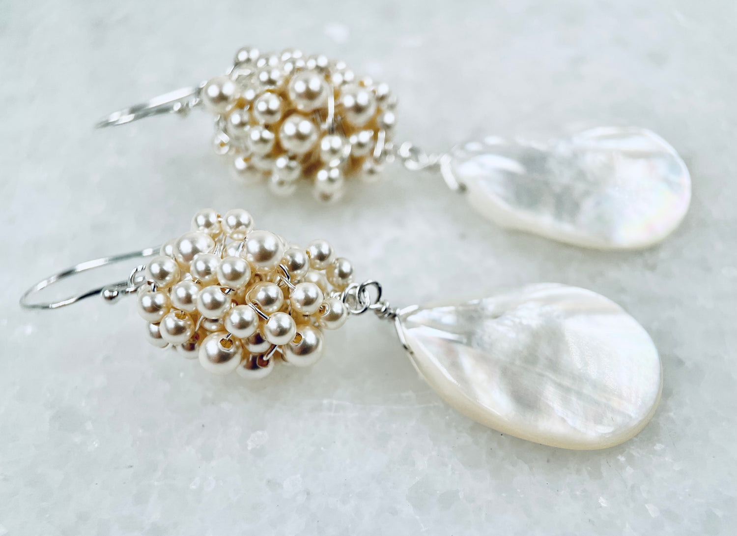 Introducing the Mina earrings, perfect embodiment of sophistication, designed to make a statement on your special day. Crafted with a high-grade mother of pearl teardrop pendant and Preciosa pearl cluster, these chandelier earrings are a timeless classic.