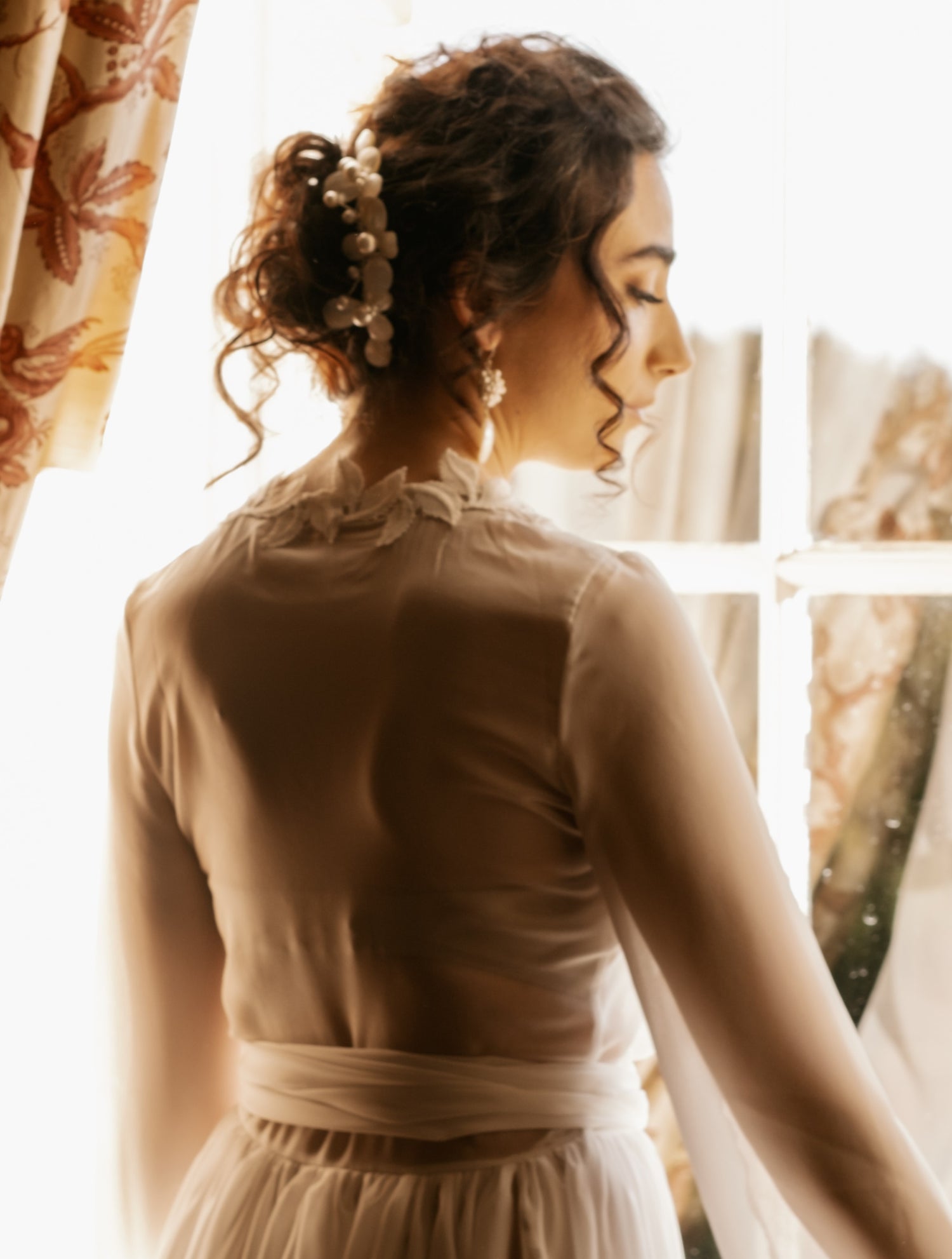 Explore my collections further, all pieces designed to be versatile and compliment a range of bridal styles. Why not complete this look by purchasing the exquisite Leilani hair comb, made from sustainable natural mother of pearl and matching Preciosa pearls.