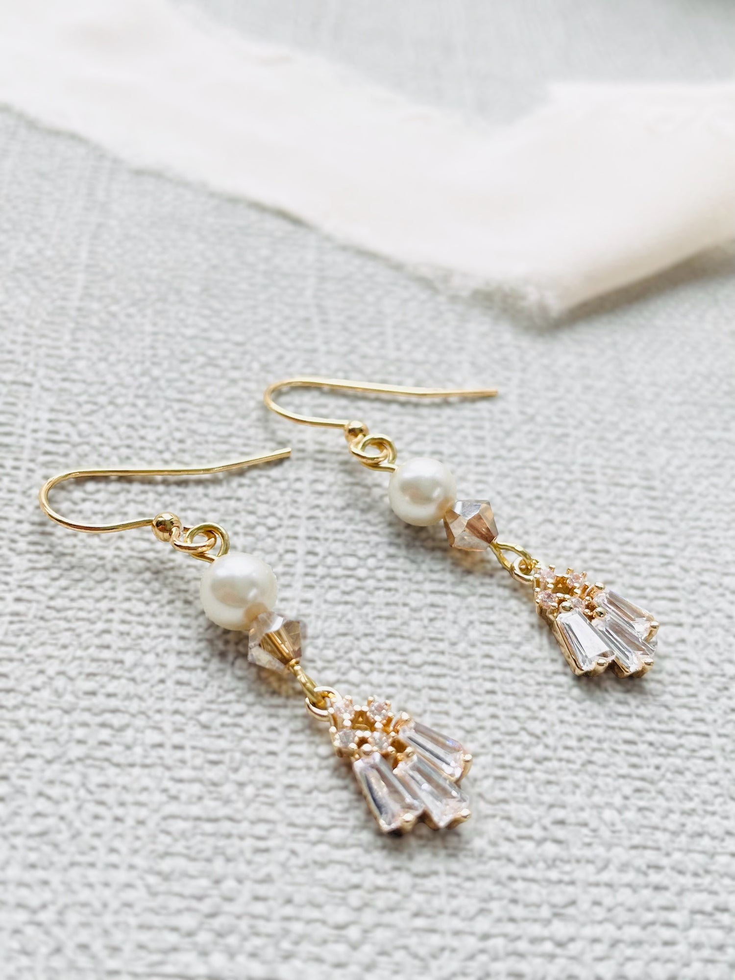 They have stunning Preciosa Czech glass pearls, bicone cut glass crystals, and art deco golden zircon pendants. These are the perfect bridal earrings for the bride who wants the luxe and glamour detail in her accessories.