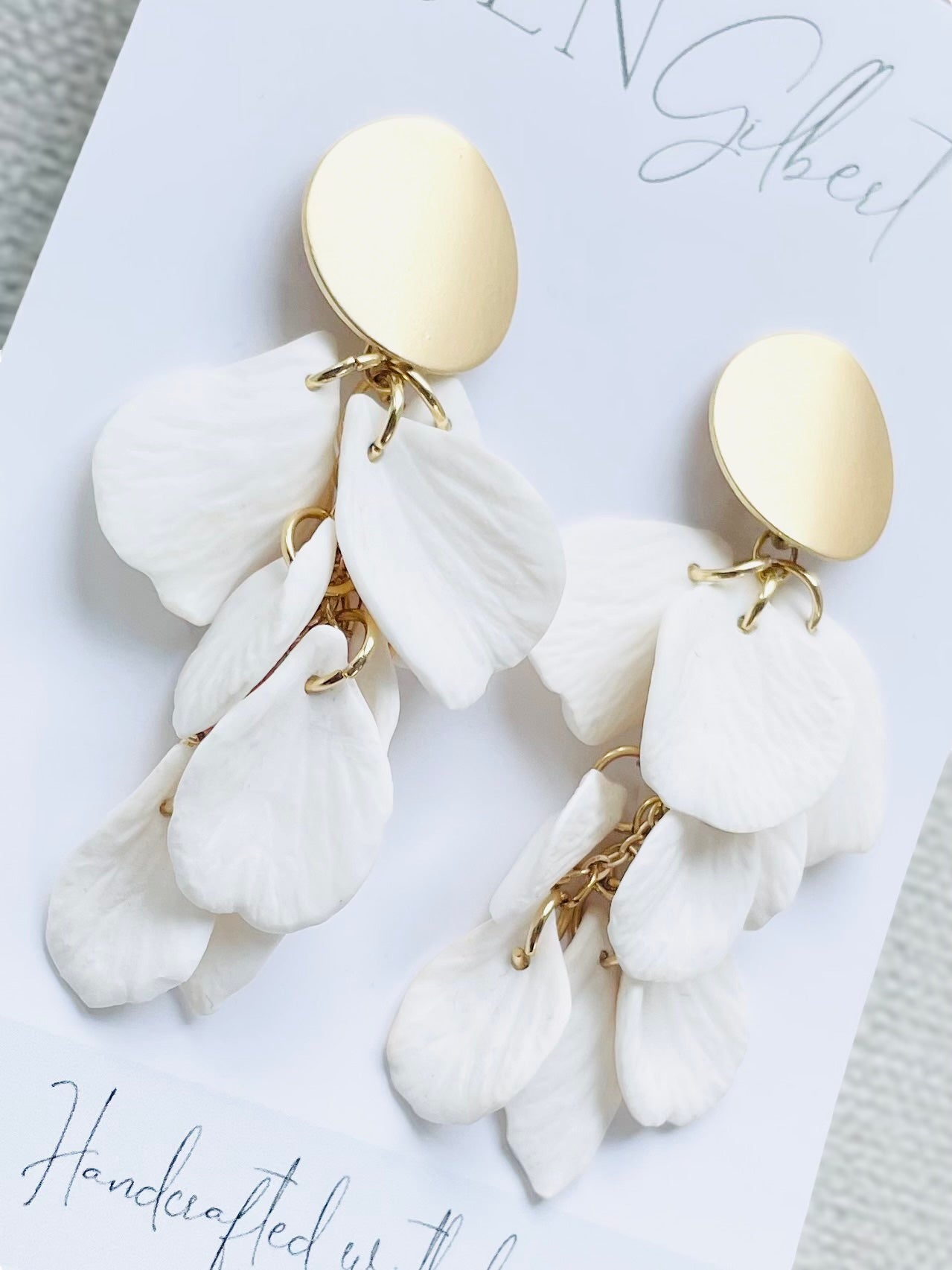The individual clay petals are hand sculpted with texture and shape, all hand-wired from a matte gold disc stud, in a cascade to create the perfect chandelier statement earring. With their unique combination of elements, the Petal earrings are sure to make you stand out and accessorise your bridal style perfectly.