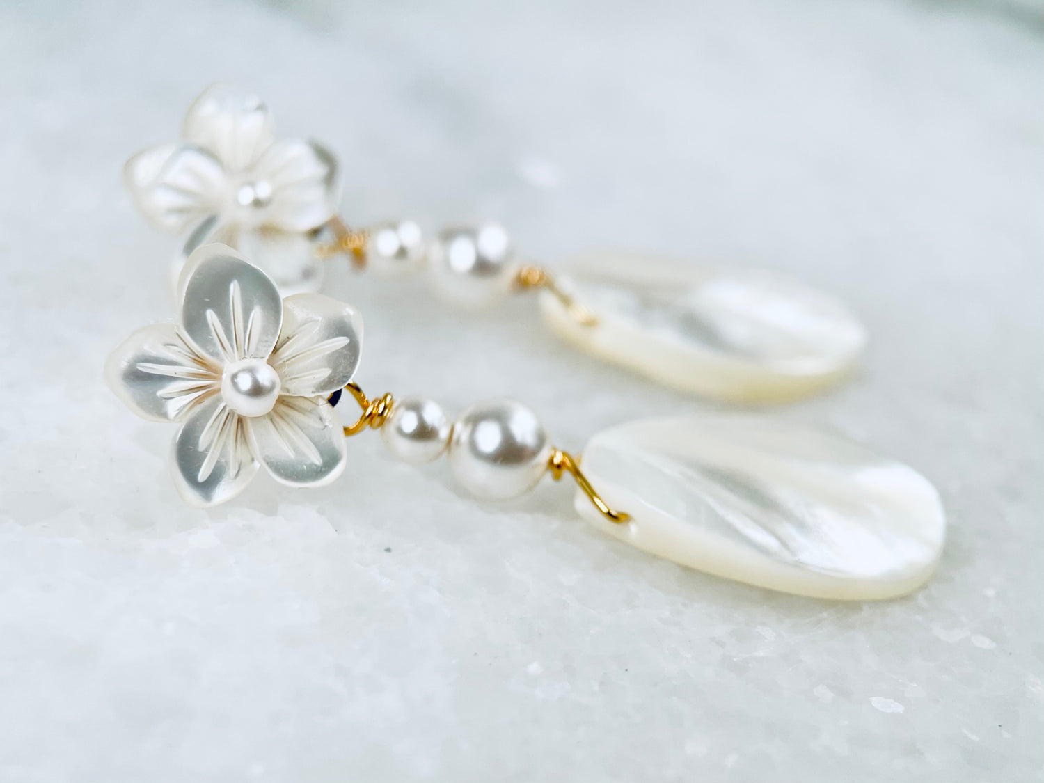 The real mother of pearl teardrop pendant is paired with a delicate, engraved genuine mother of pearl flower stud and Preciosa pearls. They exude class and elegance and are a modern step away from a simple pearl earring