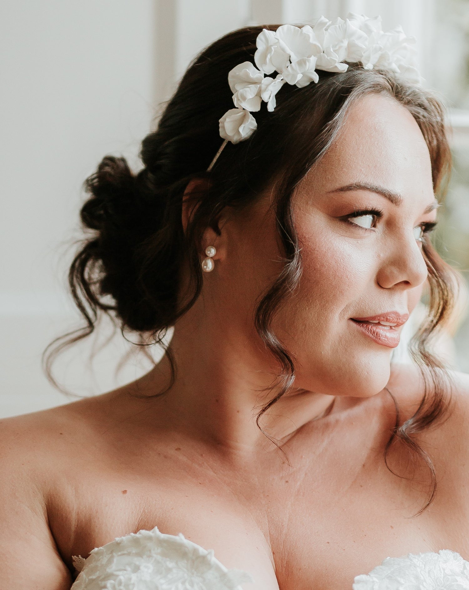 The Sweet Pea Crown is a soft, romantic piece made for brides who want something truly personal. Each flower is sculpted by hand, giving the crown a natural, organic feel that sets it apart from mass-produced accessories.