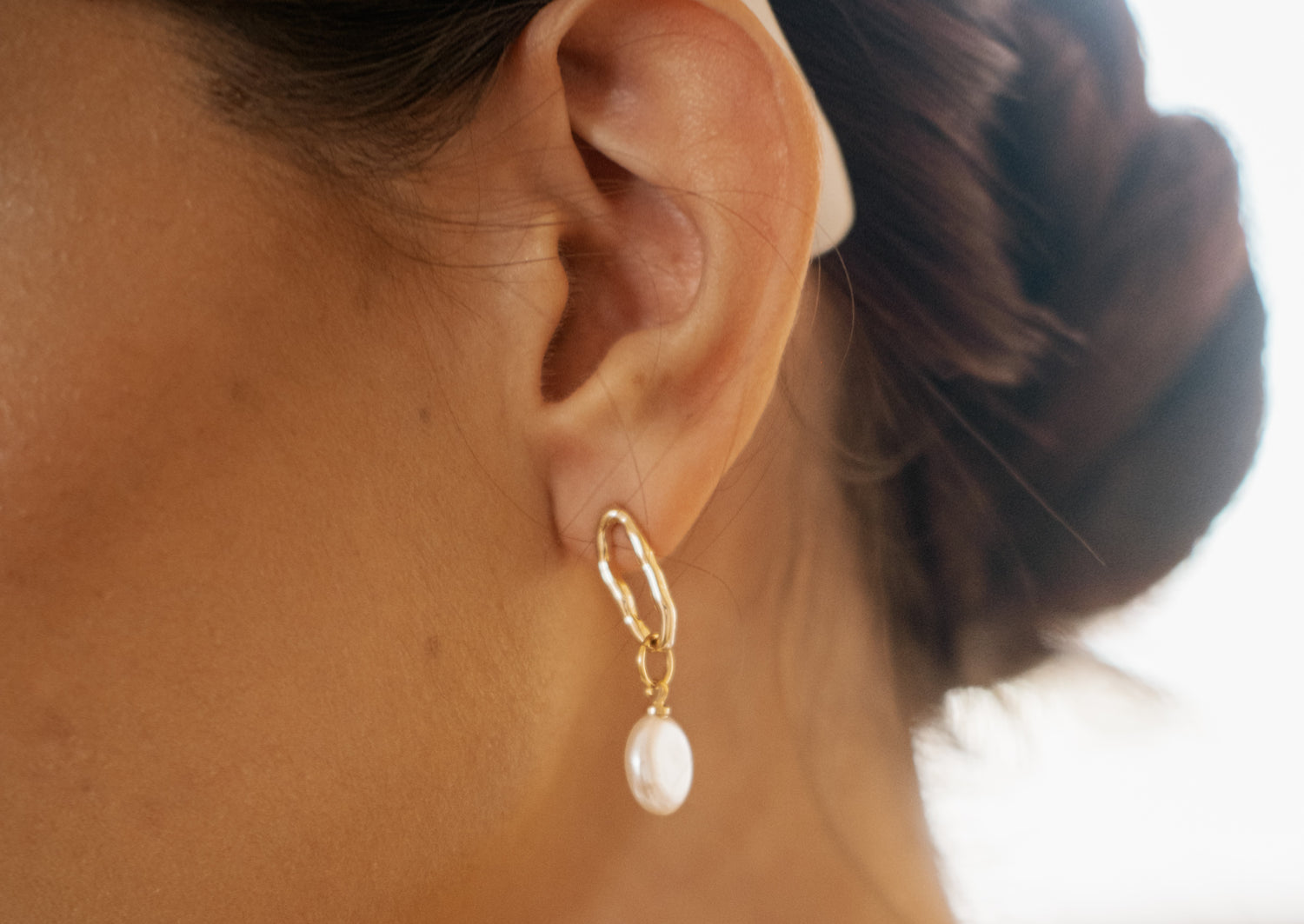 The Tessa earrings feature the highest grade freshwater pearls hung from a gold plated oval hoop earring stud. A modern take on the pearl earring and perfect if you want a touch of real pearl loveliness as your bridal accessory.